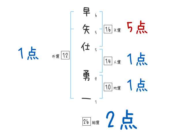 天運![]() | 早矢仕勇一さんの天運は16画の5つ星!人望が厚く大きく発展する。逆転成功が見える。 家系が持つ宿命的な運勢を表します。祖先から受け継いだ苗字ですので自分の力が及びません。家柄を象徴します。 |