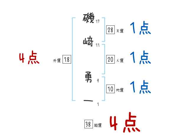 天運![]() | 磯﨑勇一さんの天運は28画の1つ星!家庭環境に注意。スポーツで活躍できる能力があるかも。 家系が持つ宿命的な運勢を表します。祖先から受け継いだ苗字ですので自分の力が及びません。家柄を象徴します。 |