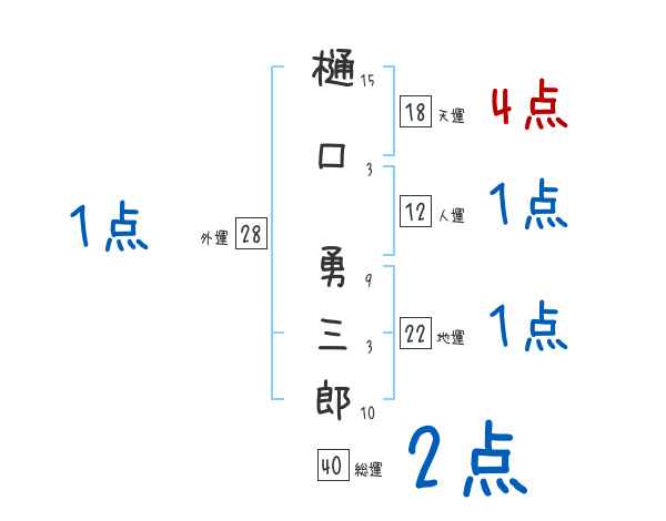 天運![]() | 樋口勇三郎さんの天運は18画の4つ星!情熱的で剛気。忍耐力があり信頼される。 家系が持つ宿命的な運勢を表します。祖先から受け継いだ苗字ですので自分の力が及びません。家柄を象徴します。 |