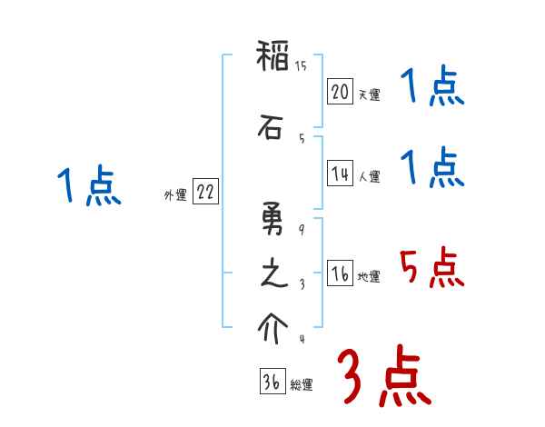 総運![]() | 稲石勇之介さんの総運は36画の3つ星!先見性が豊かです。多少神経質で苦労することも。 あなたの人生を表す1番重要な運勢です。生涯を通じて影響する総合運となり、主に50歳以降の晩年期に影響を及ぼします。 |