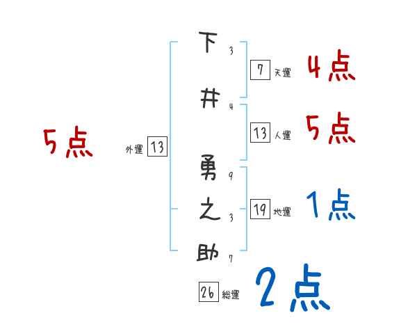 天運![]() | 下井勇之助さんの天運は7画の4つ星!強い意志や信念を持ち独立心が強い。自立する。 家系が持つ宿命的な運勢を表します。祖先から受け継いだ苗字ですので自分の力が及びません。家柄を象徴します。 |