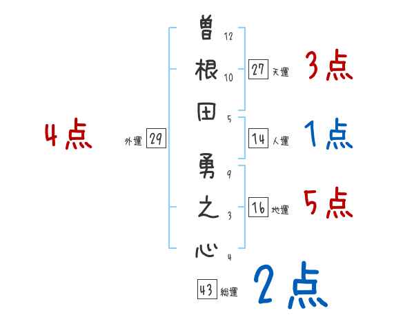 外運![]() | 曽根田勇之心さんの外運は29画の4つ星!完全主義で才能がある。厳格な心の持ち主。 生活面を象徴する運勢です。外部から受ける影響力を表し、結婚運、家庭運や職場、環境への順応性を表します。 |