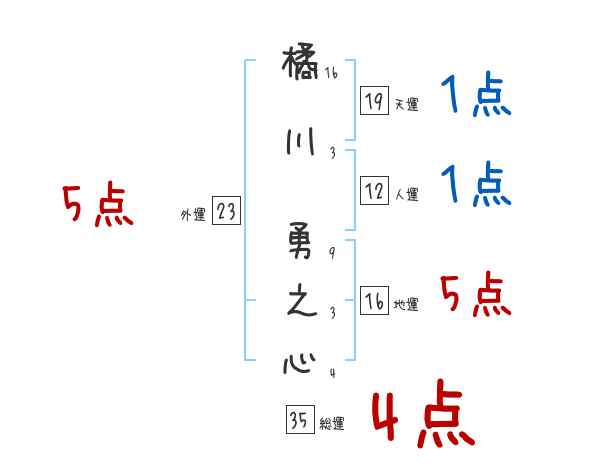 外運![]() | 橘川勇之心さんの外運は23画の5つ星!想像力に優れ活力がある。一代で成功し名誉を手に入れる。 生活面を象徴する運勢です。外部から受ける影響力を表し、結婚運、家庭運や職場、環境への順応性を表します。 |