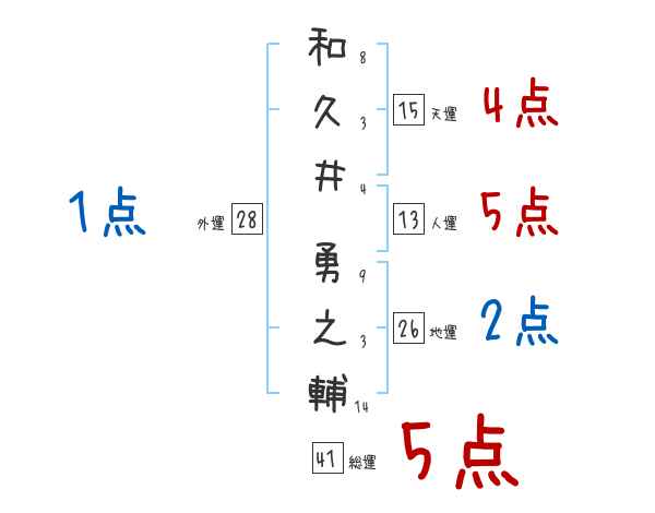 外運![]() | 和久井勇之輔さんの外運は28画の1つ星!家庭環境に注意。スポーツで活躍できる能力があるかも。 生活面を象徴する運勢です。外部から受ける影響力を表し、結婚運、家庭運や職場、環境への順応性を表します。 |
