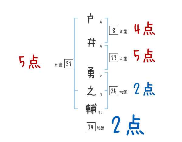 外運![]() | 戸井勇之輔さんの外運は21画の5つ星!統率力がある。独立し成功する。名誉を手に入れる。 生活面を象徴する運勢です。外部から受ける影響力を表し、結婚運、家庭運や職場、環境への順応性を表します。 |