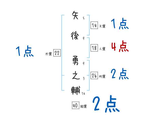 外運![]() | 矢後勇之輔さんの外運は22画の1つ星!努力することが苦手ないっぽう手先が器用。芸術性にも優れる。 生活面を象徴する運勢です。外部から受ける影響力を表し、結婚運、家庭運や職場、環境への順応性を表します。 |