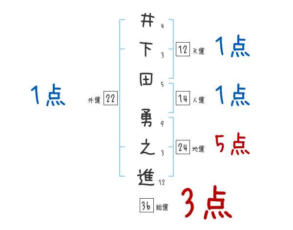 天運![]() | 井下田勇之進さんの天運は12画の1つ星!簡単な失敗で諦めてしまいやすいかも。着実に行動すると良いでしょう。 家系が持つ宿命的な運勢を表します。祖先から受け継いだ苗字ですので自分の力が及びません。家柄を象徴します。 |