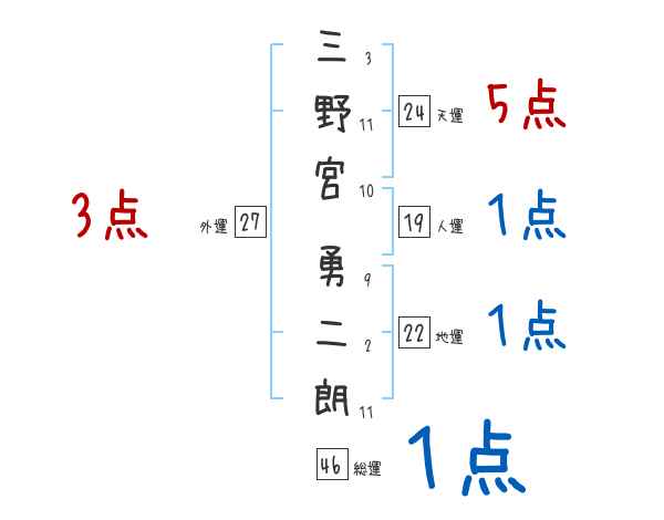 天運![]() | 三野宮勇二朗さんの天運は24画の5つ星!家庭運が良く順調な人生。金運にも恵まれる。 家系が持つ宿命的な運勢を表します。祖先から受け継いだ苗字ですので自分の力が及びません。家柄を象徴します。 |