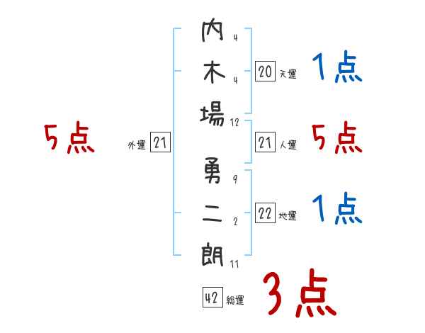 外運![]() | 内木場勇二朗さんの外運は21画の5つ星!統率力がある。独立し成功する。名誉を手に入れる。 生活面を象徴する運勢です。外部から受ける影響力を表し、結婚運、家庭運や職場、環境への順応性を表します。 |