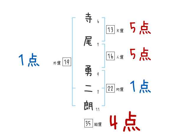 人運![]() | 寺尾勇二朗さんの人運は16画の5つ星!人望が厚く大きく発展する。逆転成功が見える。 性格や才能などを表す2番目に重要な運勢です。人間関係や協調性、社会的な成功に影響します。主に20歳から50歳ぐらいまでの中年期の運勢を表します。 |