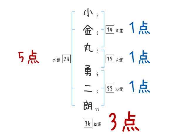 総運![]() | 小金丸勇二朗さんの総運は36画の3つ星!先見性が豊かです。多少神経質で苦労することも。 あなたの人生を表す1番重要な運勢です。生涯を通じて影響する総合運となり、主に50歳以降の晩年期に影響を及ぼします。 |