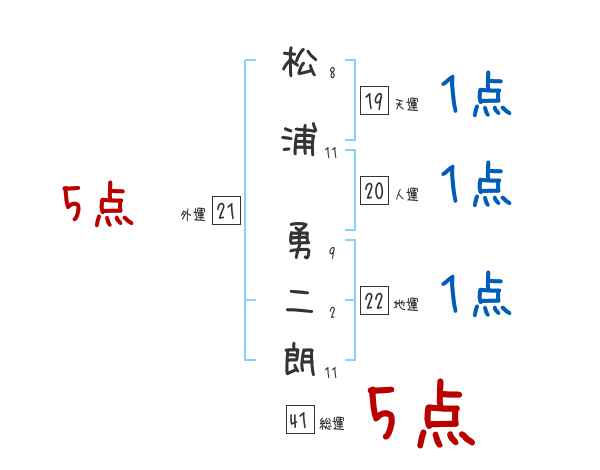 外運![]() | 松浦勇二朗さんの外運は21画の5つ星!統率力がある。独立し成功する。名誉を手に入れる。 生活面を象徴する運勢です。外部から受ける影響力を表し、結婚運、家庭運や職場、環境への順応性を表します。 |