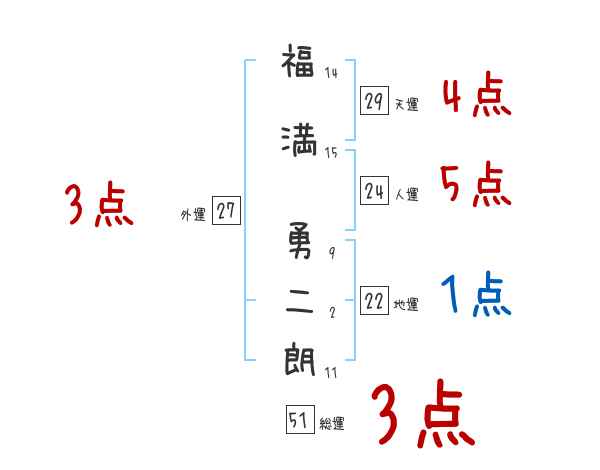 総運![]() | 福満勇二朗さんの総運は51画の3つ星!変化が激しく、危険に注意。堅実な性格。 あなたの人生を表す1番重要な運勢です。生涯を通じて影響する総合運となり、主に50歳以降の晩年期に影響を及ぼします。 |