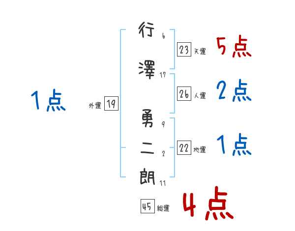 総運![]() | 行澤勇二朗さんの総運は45画の4つ星!もくもくと物事を進め達成する。地味な努力家。 あなたの人生を表す1番重要な運勢です。生涯を通じて影響する総合運となり、主に50歳以降の晩年期に影響を及ぼします。 |