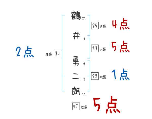 総運![]() | 鶴井勇二朗さんの総運は47画の5つ星!実力が開花し発展する円満な人生。財に恵まれる。 あなたの人生を表す1番重要な運勢です。生涯を通じて影響する総合運となり、主に50歳以降の晩年期に影響を及ぼします。 |