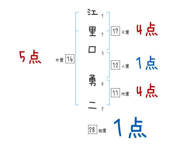 総運![]() | 江里口勇二さんの総運は28画の1つ星!家庭環境に注意。スポーツで活躍できる能力があるかも。 あなたの人生を表す1番重要な運勢です。生涯を通じて影響する総合運となり、主に50歳以降の晩年期に影響を及ぼします。 |