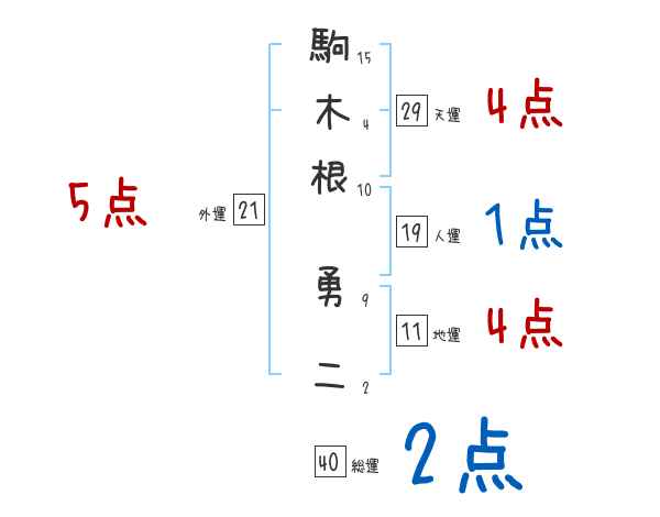 外運![]() | 駒木根勇二さんの外運は21画の5つ星!統率力がある。独立し成功する。名誉を手に入れる。 生活面を象徴する運勢です。外部から受ける影響力を表し、結婚運、家庭運や職場、環境への順応性を表します。 |