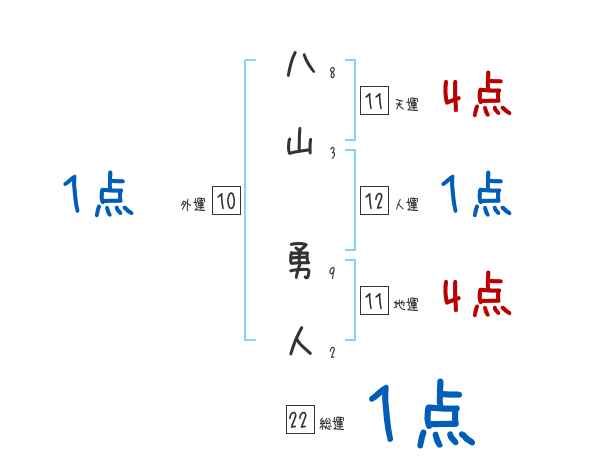 天運![]() | 八山勇人さんの天運は11画の4つ星!着実に富や地位を得る幸運な人生。 家系が持つ宿命的な運勢を表します。祖先から受け継いだ苗字ですので自分の力が及びません。家柄を象徴します。 |