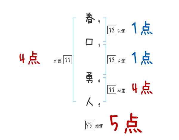 総運![]() | 春口勇人さんの総運は23画の5つ星!想像力に優れ活力がある。一代で成功し名誉を手に入れる。 あなたの人生を表す1番重要な運勢です。生涯を通じて影響する総合運となり、主に50歳以降の晩年期に影響を及ぼします。 |