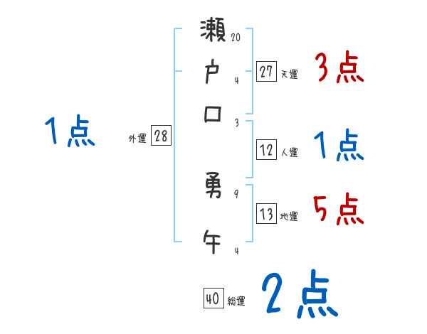 人運![]() | 瀬戸口勇午さんの人運は12画の1つ星!簡単な失敗で諦めてしまいやすいかも。着実に行動すると良いでしょう。 性格や才能などを表す2番目に重要な運勢です。人間関係や協調性、社会的な成功に影響します。主に20歳から50歳ぐらいまでの中年期の運勢を表します。 |
