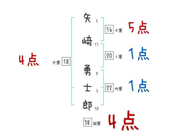 外運![]() | 矢﨑勇士郎さんの外運は18画の4つ星!情熱的で剛気。忍耐力があり信頼される。 生活面を象徴する運勢です。外部から受ける影響力を表し、結婚運、家庭運や職場、環境への順応性を表します。 |