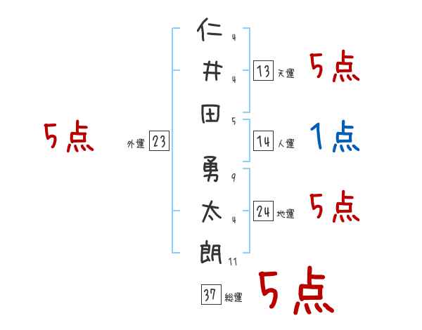 外運![]() | 仁井田勇太朗さんの外運は23画の5つ星!想像力に優れ活力がある。一代で成功し名誉を手に入れる。 生活面を象徴する運勢です。外部から受ける影響力を表し、結婚運、家庭運や職場、環境への順応性を表します。 |