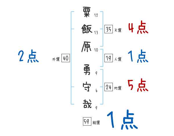 地運![]() | 粟飯原勇守哉さんの地運は24画の5つ星!家庭運が良く順調な人生。金運にも恵まれる。 個性を表す基礎的な運勢です。性格形成や対人関係、行動力など家庭環境に影響されます。主に誕生してから20歳くらいまでの若年期の運勢を表します。 |