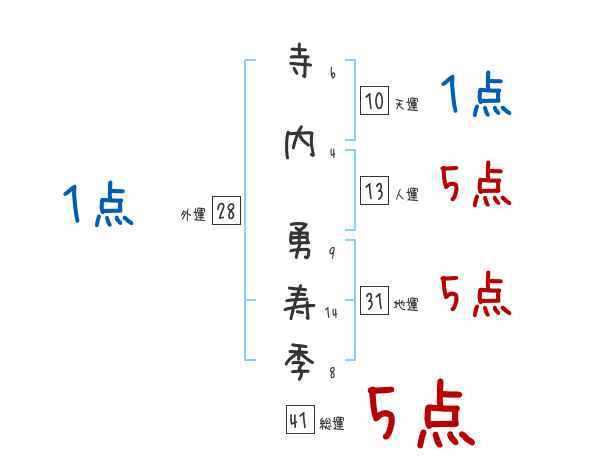 天運![]() | 寺内勇寿季さんの天運は10画の1つ星!不安を感じやすい傾向。ストレスを抱えないように注意しましょう。 家系が持つ宿命的な運勢を表します。祖先から受け継いだ苗字ですので自分の力が及びません。家柄を象徴します。 |