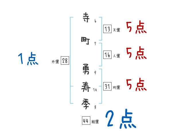 人運![]() | 寺町勇寿季さんの人運は16画の5つ星!人望が厚く大きく発展する。逆転成功が見える。 性格や才能などを表す2番目に重要な運勢です。人間関係や協調性、社会的な成功に影響します。主に20歳から50歳ぐらいまでの中年期の運勢を表します。 |