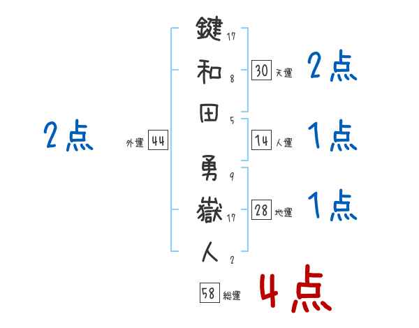 天運![]() | 鍵和田勇嶽人さんの天運は30画の2つ星!浮き沈みの激しさに注意しましょう。 家系が持つ宿命的な運勢を表します。祖先から受け継いだ苗字ですので自分の力が及びません。家柄を象徴します。 |