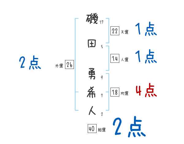 | 天運  | 磯田勇希人さんの天運は22画の1つ星!努力することが苦手ないっぽう手先が器用。芸術性にも優れる。家系が持つ宿命的な運勢を表します。祖先から受け継いだ苗字ですので自分の力が及びません。家柄を象徴します。 |