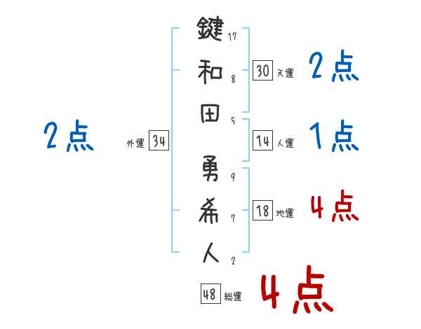 総運![]() | 鍵和田勇希人さんの総運は48画の4つ星!賢明な性格で人望が厚い。指導力があり多くの人に尊敬される。 あなたの人生を表す1番重要な運勢です。生涯を通じて影響する総合運となり、主に50歳以降の晩年期に影響を及ぼします。 |