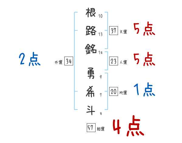 総運![]() | 根路銘勇希斗さんの総運は57画の4つ星!向上心があり人望がある。地位を得る。 あなたの人生を表す1番重要な運勢です。生涯を通じて影響する総合運となり、主に50歳以降の晩年期に影響を及ぼします。 |