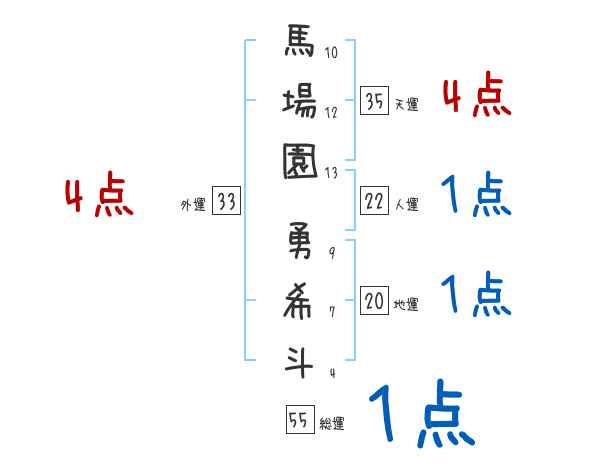 天運![]() | 馬場園勇希斗さんの天運は35画の4つ星!温厚な性格で感受性が高い。穏和な性格で人望が厚い。 家系が持つ宿命的な運勢を表します。祖先から受け継いだ苗字ですので自分の力が及びません。家柄を象徴します。 |