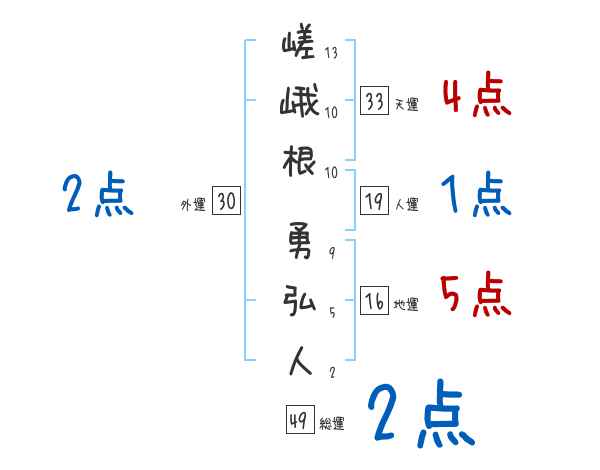 総運![]() | 嵯峨根勇弘人さんの総運は49画の2つ星!不安定な性格で明暗がある人生。周りの人には支援されやすい。 あなたの人生を表す1番重要な運勢です。生涯を通じて影響する総合運となり、主に50歳以降の晩年期に影響を及ぼします。 |