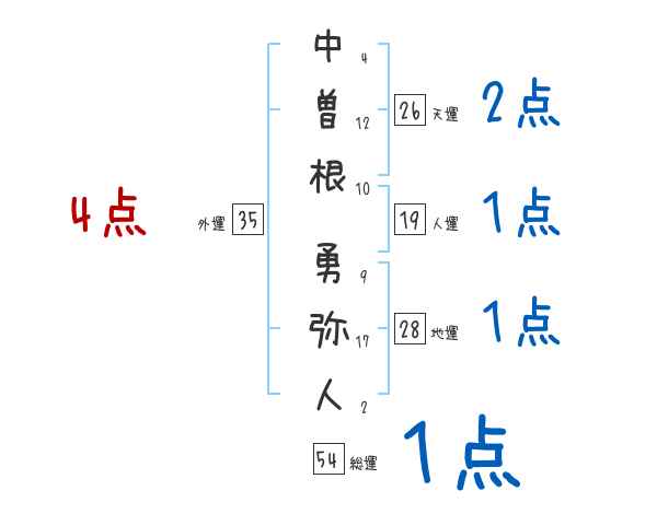 | 天運  | 中曽根勇弥人さんの天運は26画の2つ星!波瀾万丈かも。信頼できる人を大事にしましょう。家系が持つ宿命的な運勢を表します。祖先から受け継いだ苗字ですので自分の力が及びません。家柄を象徴します。 |