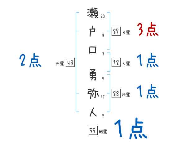 天運![]() | 瀬戸口勇弥人さんの天運は27画の3つ星!頭脳明晰だが強情で摩擦が多い傾向。孤立に注意。 家系が持つ宿命的な運勢を表します。祖先から受け継いだ苗字ですので自分の力が及びません。家柄を象徴します。 |