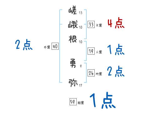 天運![]() | 嵯峨根勇弥さんの天運は33画の4つ星!権力志向でプライドが高い。勇気があり運を切り開き成功する。 家系が持つ宿命的な運勢を表します。祖先から受け継いだ苗字ですので自分の力が及びません。家柄を象徴します。 |