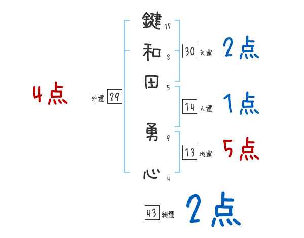 天運![]() | 鍵和田勇心さんの天運は30画の2つ星!浮き沈みの激しさに注意しましょう。 家系が持つ宿命的な運勢を表します。祖先から受け継いだ苗字ですので自分の力が及びません。家柄を象徴します。 |