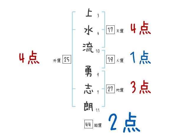 総運![]() | 上水流勇志朗さんの総運は44画の2つ星!誠実で慎重な性格。物事を考えすぎないように注意しましょう。 あなたの人生を表す1番重要な運勢です。生涯を通じて影響する総合運となり、主に50歳以降の晩年期に影響を及ぼします。 |