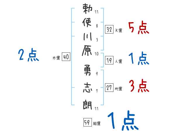 天運![]() | 勅使川原勇志朗さんの天運は32画の5つ星!柔軟性があり成功する。チャンスが多く金運が良い。 家系が持つ宿命的な運勢を表します。祖先から受け継いだ苗字ですので自分の力が及びません。家柄を象徴します。 |