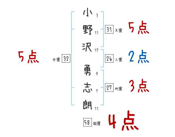 外運![]() | 小野沢勇志朗さんの外運は32画の5つ星!柔軟性があり成功する。チャンスが多く金運が良い。 生活面を象徴する運勢です。外部から受ける影響力を表し、結婚運、家庭運や職場、環境への順応性を表します。 |
