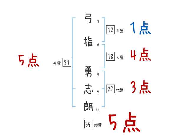 総運![]() | 弓指勇志朗さんの総運は39画の5つ星!社交性に優れ人望が厚い。人の上に立ち成功する。 あなたの人生を表す1番重要な運勢です。生涯を通じて影響する総合運となり、主に50歳以降の晩年期に影響を及ぼします。 |