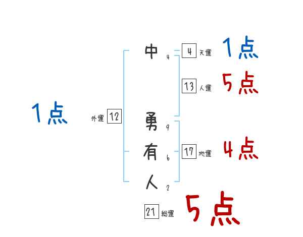 人運![]() | 中勇有人さんの人運は13画の5つ星!才能に恵まれ人気がある。名声を手に入れる。円満な人生。 性格や才能などを表す2番目に重要な運勢です。人間関係や協調性、社会的な成功に影響します。主に20歳から50歳ぐらいまでの中年期の運勢を表します。 |