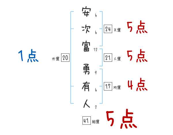 天運![]() | 安次富勇有人さんの天運は24画の5つ星!家庭運が良く順調な人生。金運にも恵まれる。 家系が持つ宿命的な運勢を表します。祖先から受け継いだ苗字ですので自分の力が及びません。家柄を象徴します。 |