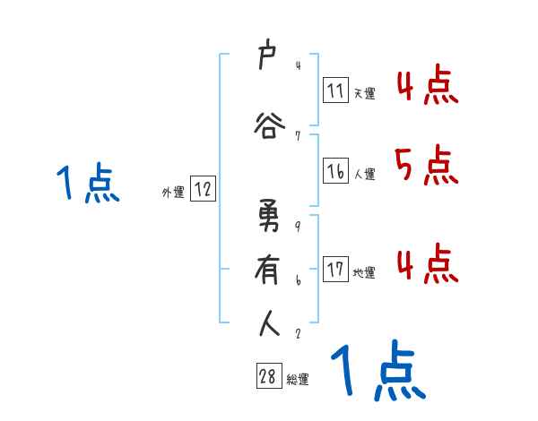 総運![]() | 戸谷勇有人さんの総運は28画の1つ星!家庭環境に注意。スポーツで活躍できる能力があるかも。 あなたの人生を表す1番重要な運勢です。生涯を通じて影響する総合運となり、主に50歳以降の晩年期に影響を及ぼします。 |