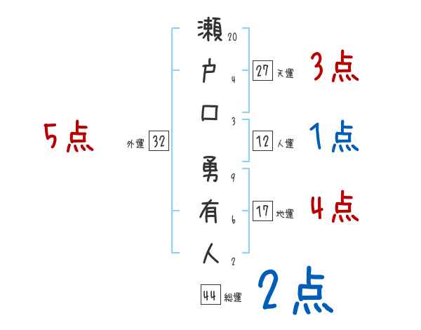 外運![]() | 瀬戸口勇有人さんの外運は32画の5つ星!柔軟性があり成功する。チャンスが多く金運が良い。 生活面を象徴する運勢です。外部から受ける影響力を表し、結婚運、家庭運や職場、環境への順応性を表します。 |