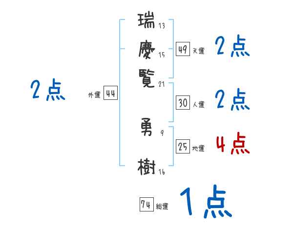 天運![]() | 瑞慶覧勇樹さんの天運は49画の2つ星!不安定な性格で明暗がある人生。周りの人には支援されやすい。 家系が持つ宿命的な運勢を表します。祖先から受け継いだ苗字ですので自分の力が及びません。家柄を象徴します。 |