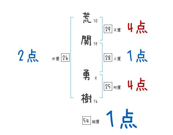 天運![]() | 荒関勇樹さんの天運は29画の4つ星!完全主義で才能がある。厳格な心の持ち主。 家系が持つ宿命的な運勢を表します。祖先から受け継いだ苗字ですので自分の力が及びません。家柄を象徴します。 |