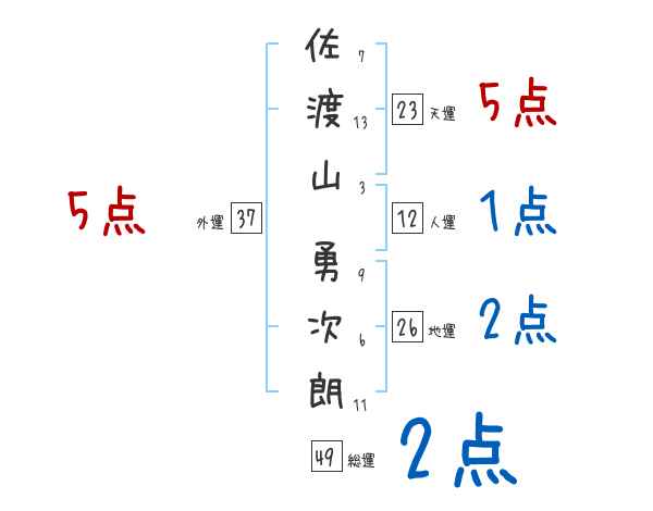 天運![]() | 佐渡山勇次朗さんの天運は23画の5つ星!想像力に優れ活力がある。一代で成功し名誉を手に入れる。 家系が持つ宿命的な運勢を表します。祖先から受け継いだ苗字ですので自分の力が及びません。家柄を象徴します。 |